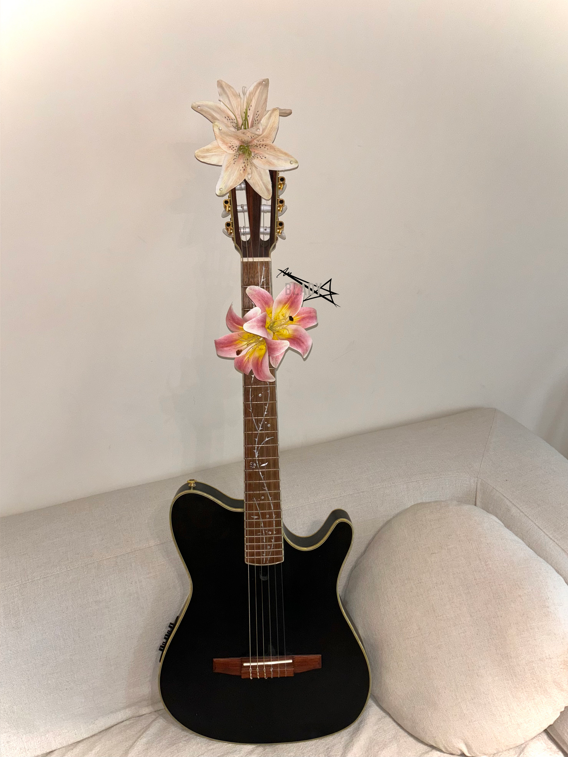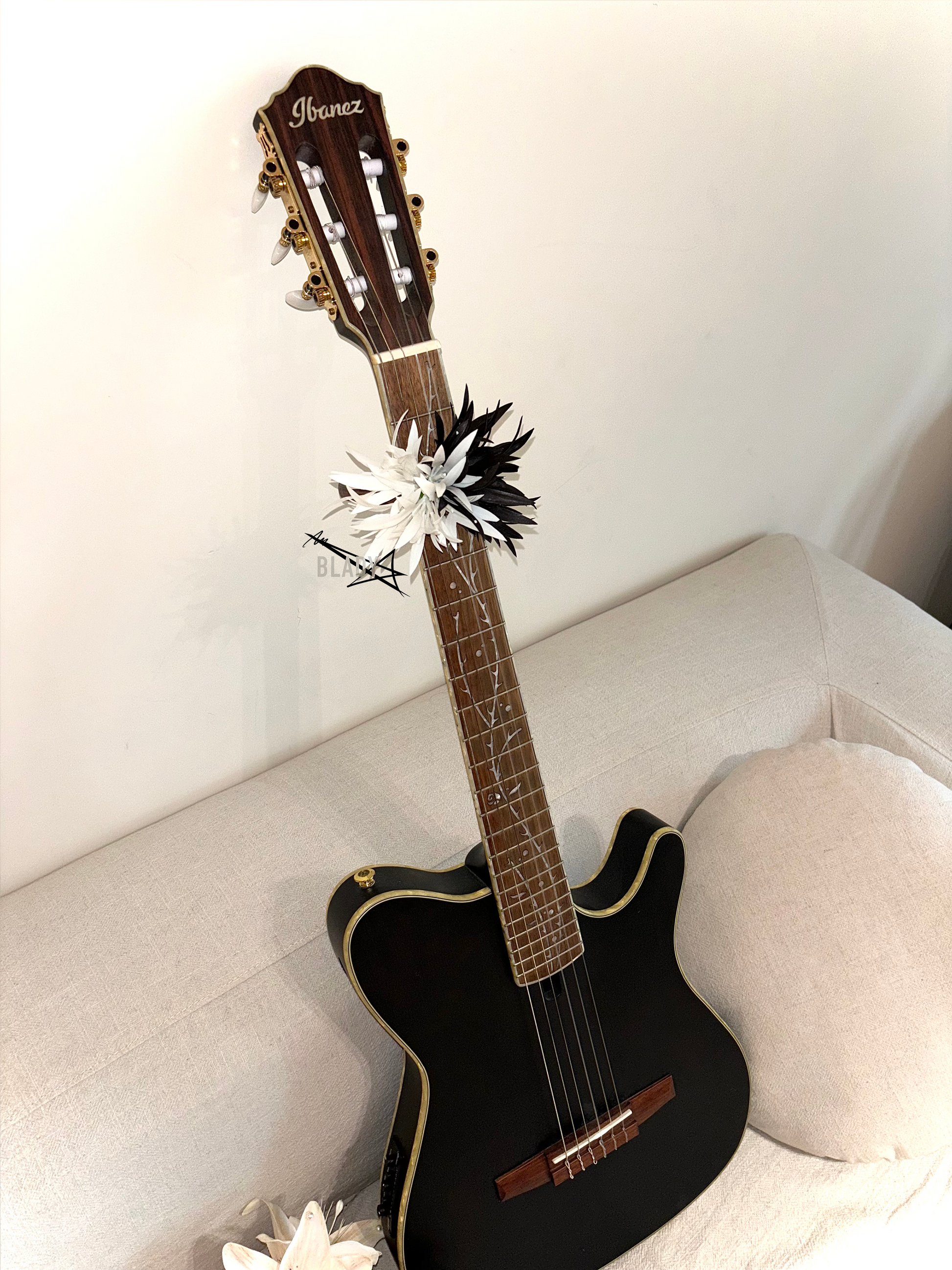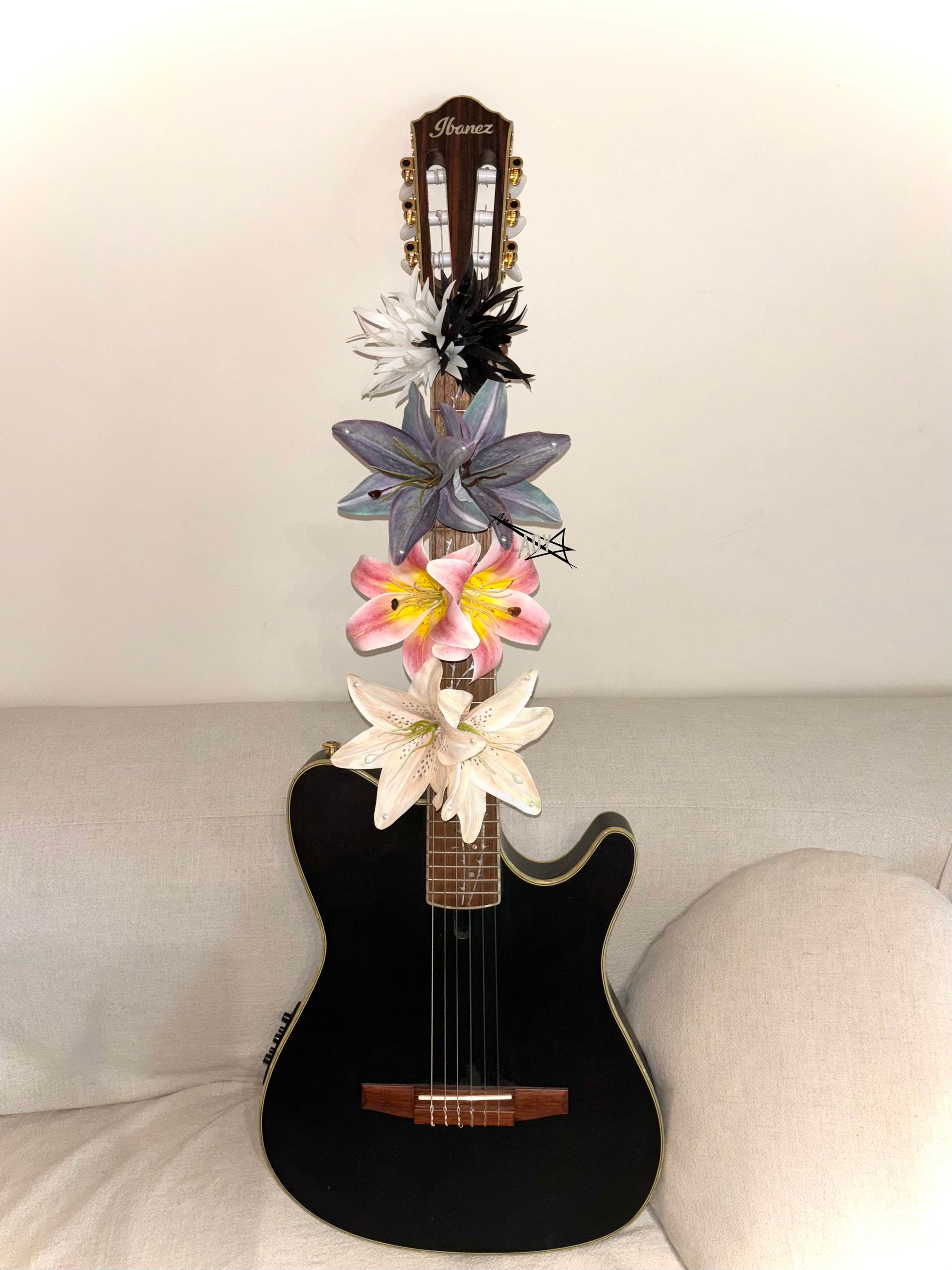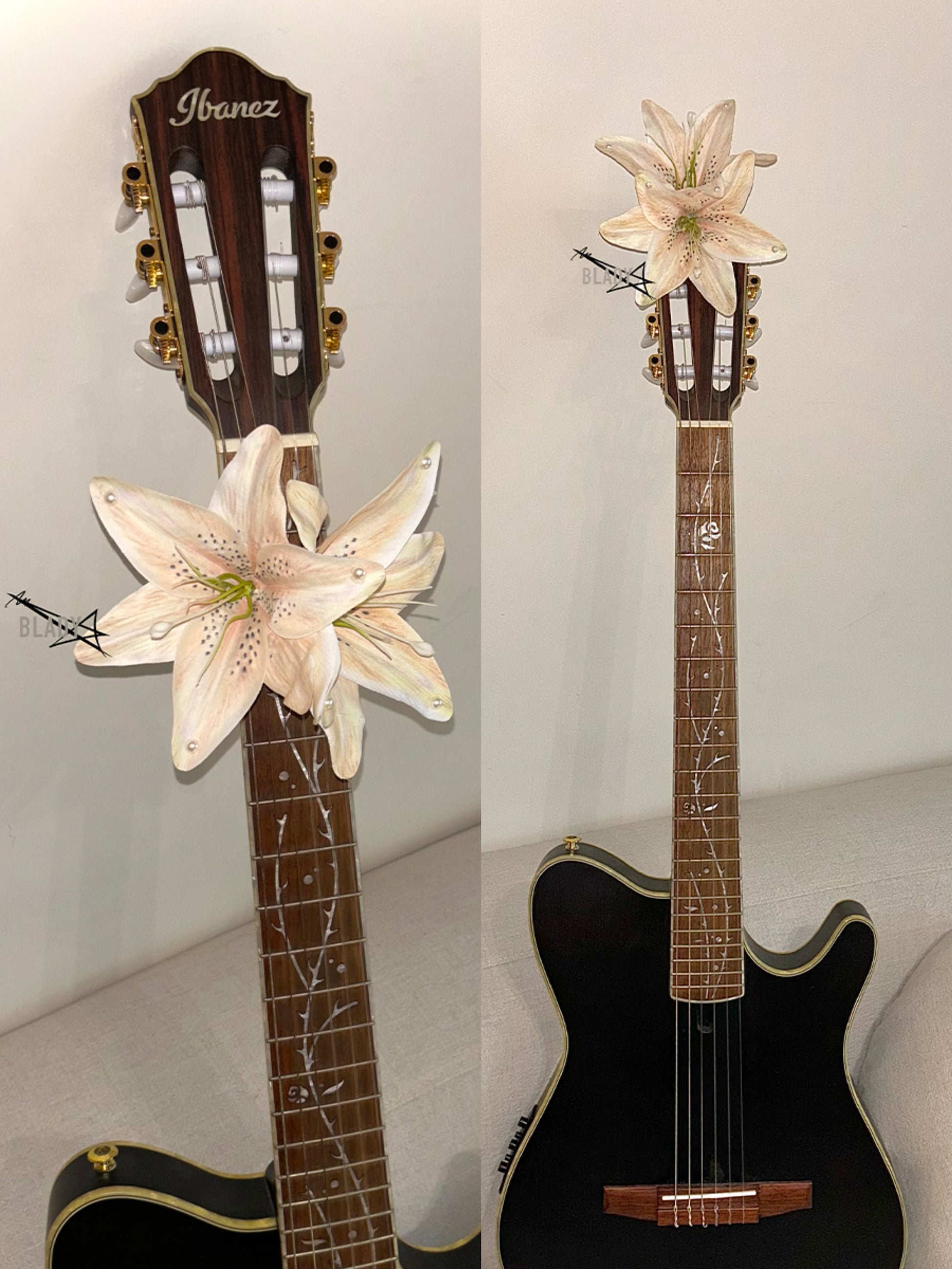 自然の柔らかな美しさと音楽の流動性を融合させ、ギターの上に咲き誇るミニチュアガーデンを創り出すために、立体的な花の要素を選びました。それぞれの花には言葉があり、様々な感情や物語を象徴しています。まるで音符のように、演奏者の手を通して意味を帯びていくのです。