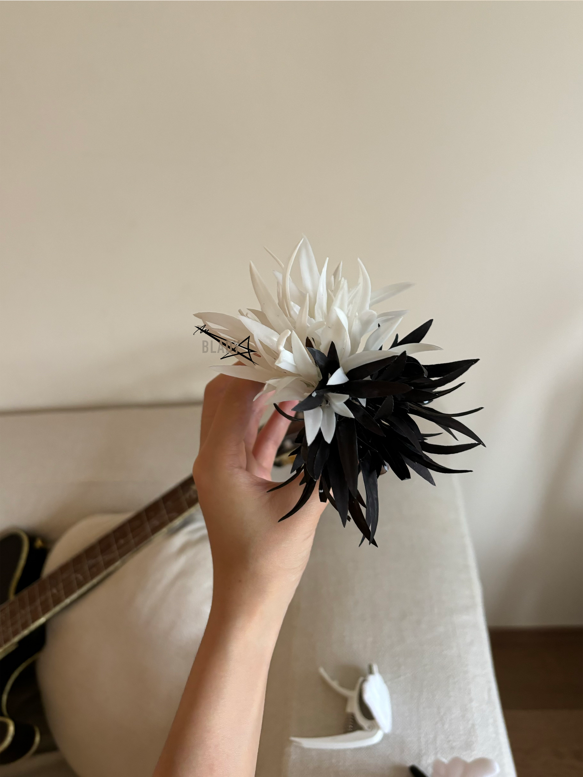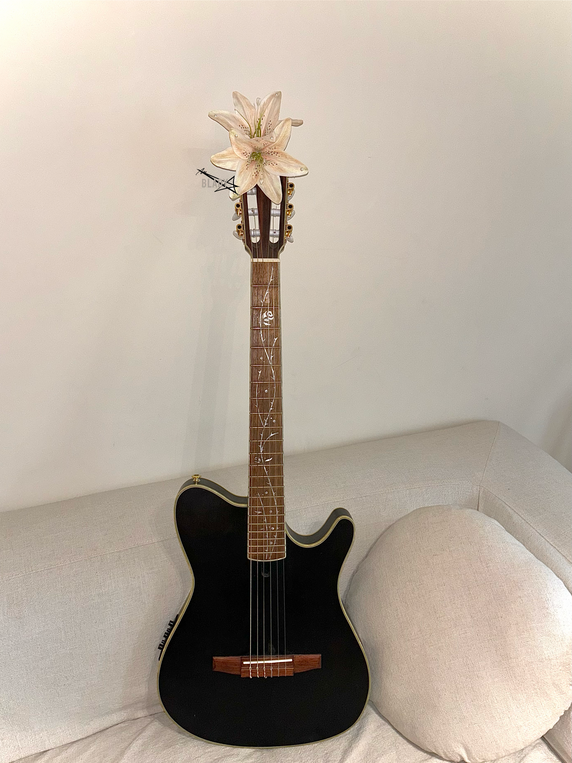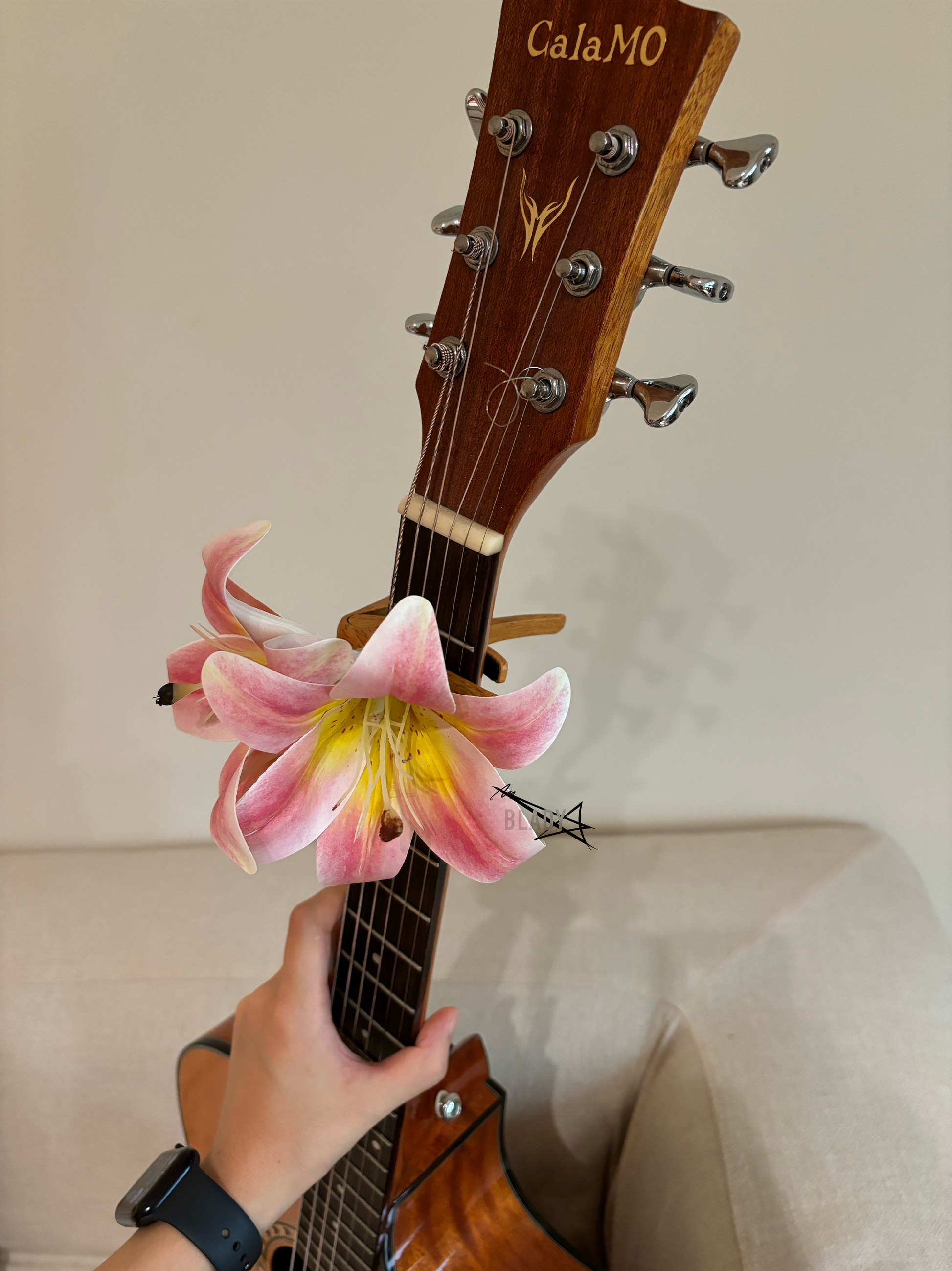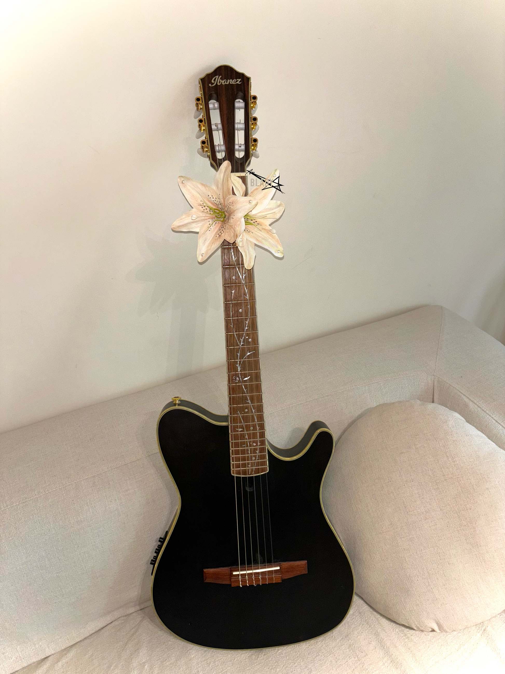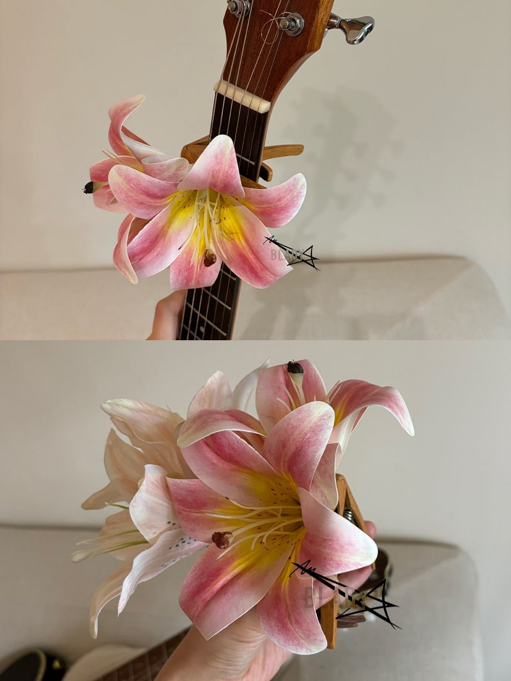自然の柔らかな美しさと音楽の流動性を融合させ、ギターの上に咲き誇るミニチュアガーデンを創り出すために、立体的な花の要素を選びました。それぞれの花には言葉があり、様々な感情や物語を象徴しています。まるで音符のように、演奏者の手を通して意味を帯びていくのです。